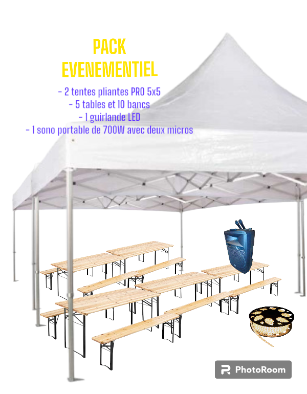 🎉 Pack événementiel clé en main – 2 tentes 5x5, tables et bancs, éclairage et sono 🎉